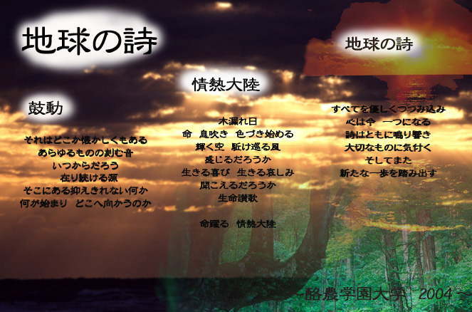 大地に抱かれ みんなここに生きてる 心つないで  ぼくらはうたう かがやく空へ 届けよう 愛のうた かなでよう この地球の詩を